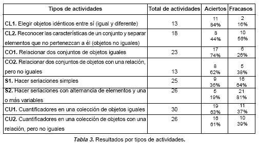 Los resultados señalan que las dificultades varían en los diferentes tipos de actividades. Por ejemplo, en el concepto de clasificación observamos que las de Reconocer las características de un conjunto y separar elementos que no pertenezcan a él (CL2) presentan mayor dificultad que las de Elegir objetos idénticos entre sí (CL1), con porcentajes acertados del 44% y el 84%, respectivamente. Posiblemente tal resultado se deba a la dificultad diferenciada de las tareas: en las actividades de CL2 los alumnos necesitan buscar la relación de pertenencia, mientras que en las de CL1 tienen que hallar los elementos idénticos.