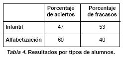 Al hacer un análisis de los resultados, distinguiendo entre los tipos de alumnos que participaron en esta experiencia (véase Tabla 4), notamos que los alumnos de Alfabetización tienen mayor porcentaje de aciertos que los de Infantil. Con esto se ratifica que los alumnos con Síndrome de Down pueden adquirir habilidades lógicas y mejorarlas en su madurez, especialmente si continúan su formación académica.