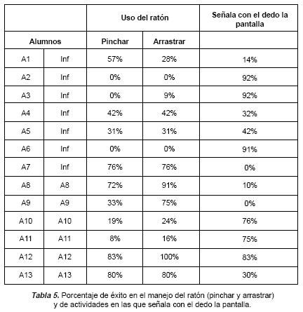 De este modo, ahondamos en las videograbaciones si los alumnos mostraban un uso eficiente del ratón, distinguiendo entre su facilidad para "pinchar con el ratón" y para "arrastrar el ratón", dos acciones fundamentales al resolver las actividades del tutorial. Se consideró como un éxito cuando el alumno usaba solo el ratón (arrastrar y pinchar) sin ayuda del profesor. La Tabla 5 presenta los porcentajes de éxito en el manejo del ratón.