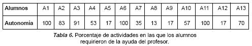 En el análisis a cada una de las actividades observamos a través de los videos si los alumnos respondían por sí solos a la actividad, sin necesitar la ayuda del profesor. La Tabla 6 contiene los porcentajes de actividades en las que los alumnos requirieron de la asistencia del profesor en más de una ocasión.