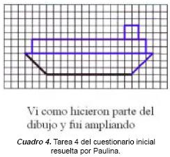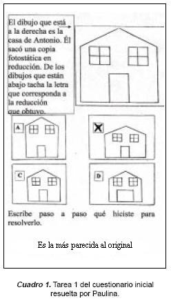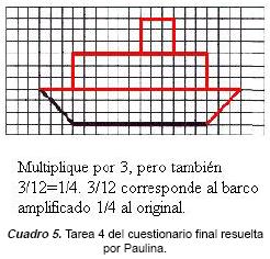 Con respecto a las cuatro tareas que Paulina respondió en forma errónea, hacemos referencia a ellas en las tareas 1 y 4. La tarea 1 aborda la elección de la reducción del dibujo de una casa; Paulina seleccionó aquella que no correspondía, dando como argumento "que era la más parecida a la original", mientras que en el cuestionario final eligió la casa reducida, basándose primero en su intuición y después en la medición de cada parte que la integraba. Así, obtuvo las razones entre las distintas magnitudes de la casa reducida con respecto al dibujo original, pero también volvió a mencionar en su explicación que la casa "C se parece a la casa de Antonio", agregando que "es semejante, es decir proporcional" (véanse Cuadros 1 y 2). Se puede notar que la expresión "se parece a" cambió de significado para ella entre la aplicación del cuestionario inicial y la del final, pues mostró una comprensión del término proporción como la relación de equivalencia entre dos razones, sin dejar de lado la parte intuitiva, que fue explotada a lo largo del programa de enseñanza. Hay otras evidencias para afirmar esto: Paulina resolvió de manera incorrecta la tarea 4 en el cuestionario inicial, pero de forma correcta en el final. Lo importante son las explicaciones que dio, las cuales se dan a conocer en los Cuadros 4 y 5.