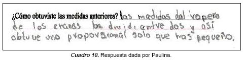 El hecho de que Paulina, por un lado, duplicara todas las magnitudes para hacer la amplificación y, por otro, obtuviera la mitad de las mismas para hacer la reducción, reflejó el significado adecuado del término proporción. Además, el señalamiento que hizo respecto a que una figura reducida o amplificada conserva la misma forma, sólo que cambia de tamaño, indicó que, aunque trabajó muy bien con algoritmos, no quedó opacado su pensamiento cualitativo.