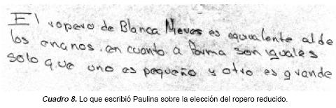 Asimismo, Paulina mostró un manejo de lo conceptual cargado de sentido, al identificar a la razón como una relación y a la proporción como la relación de equivalencia entre razones (Hart, 1988), y no abandonó el aspecto cualitativo, ya que usó categorías verbales y el sentido común para constatar que el ropero elegido era el correcto. Al respecto, escribió lo que se indica el Cuadro 8.