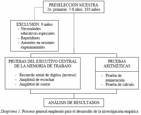 Antes de llevar a cabo el estudio, se sensibilizó a los niños para evitar posibles interferencias posteriores, como problemas de conducta. En relación con la administración de las pruebas, se repartieron en primer lugar las pruebas aritméticas de forma colectiva, y luego las distintas pruebas de ejecutivo central de forma individual: Recuerdo serial de dígitos (inverso), amplitud de escuchar y amplitud de contar.