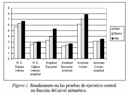 Para determinar una posible relación entre el rendimiento aritmético y la habilidad del ejecutivo central, correlacionamos en primer lugar las puntuaciones de las pruebas aritméticas con las del ejecutivo central; el índice de correlación de Pearson obtenido ( r = 0,52)= indicó que ambas tareas mantenían una relación importante.