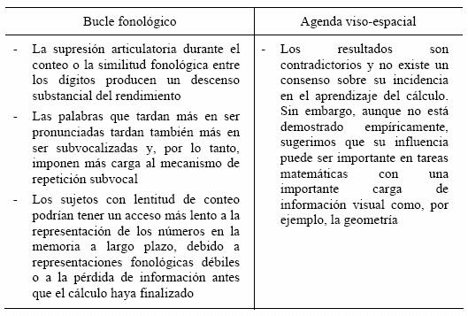 Como ya mencionamos en la introducción, Logie, Gilhooly y Wynn (1994) demostraron que la actuación en el cálculo se interrumpe cuando el ejecutivo central se sobrecarga; Hitch y Towse (1995) y Towse y Hitch (1997), señalaron que el ejecutivo central está implicado en tareas aritméticas, al precisar que estas actividades cognitivas dependen de un sistema central de capacidad limitada. Lemaire, Abdi y Fayol (1996) llegaron a la conclusión de que, para verificar cálculos de respuesta verdadera, están implicados los recursos atencionales tanto del ejecutivo central como del bucle fonológico. Y más recientemente, Engle, Kane y Tuholski (1999), Fürst y Hitch (2000), Gathercole y Pickering (2000a, 2000b) y McLean y Hitch (1999), entre otros, también han enfatizado en el relevante papel que cumple este subsistema.