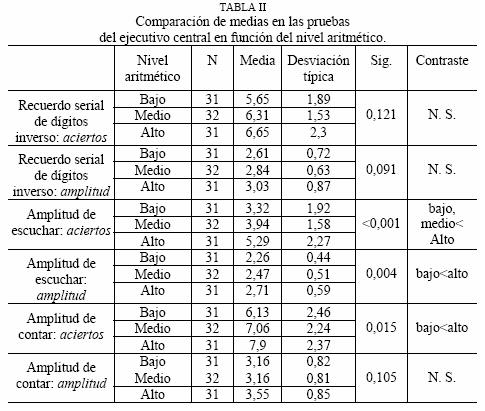 En tercer lugar, nos interesaba determinar si la capacidad del ejecutivo central incidía en las tareas aritméticas de todos los sujetos por igual, o si varía según su nivel (bajo, medio o alto). Para dividir la muestra en tres grupos bajo, medio y alto usamos el procedimiento RANKS de SPSS sobre la puntuación de las pruebas aritméticas, mientras que para comparar las medias ocupamos la prueba de contraste (posthoc) de Scheffé de SPSS. Los resultados se exponen en la Tabla II.