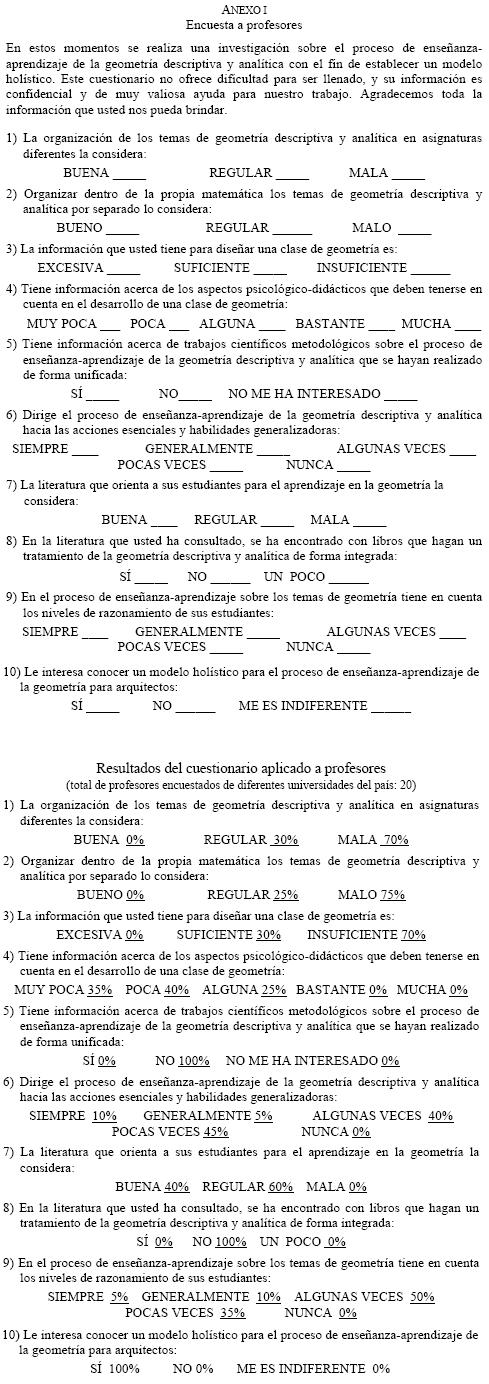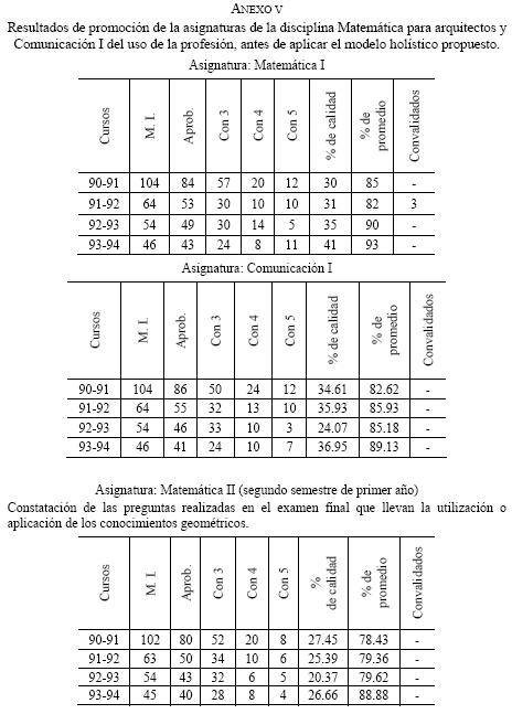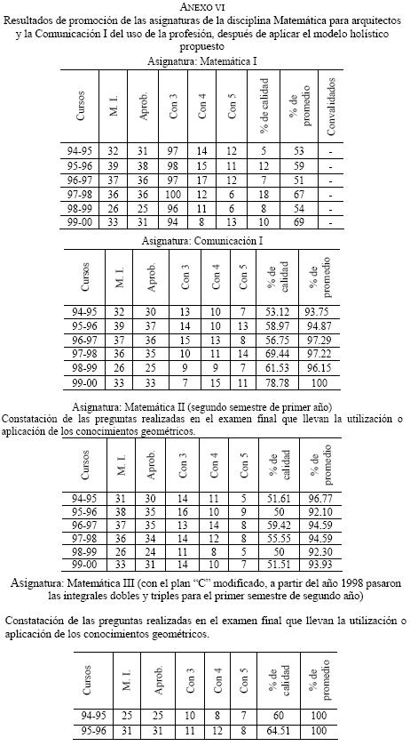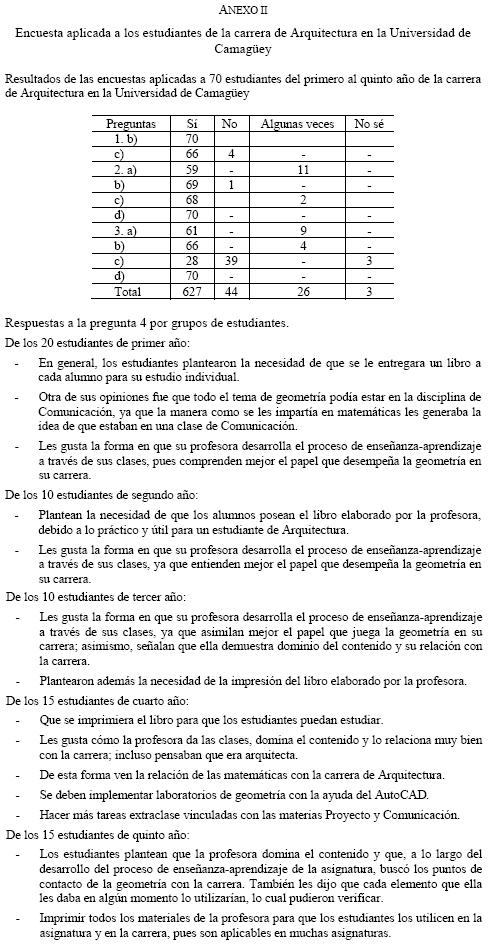 La aplicación del modelo holístico para el proceso de enseñanzaaprendizaje de la geometría para arquitectos propició una mejor adquisición de los conocimientos geométricos en los estudiantes. Esto se hizo notorio en la aplicación exitosa de los contenidos geométricos en las asignaturas de ejercicios de la profesión que comprende la carrera, en las encuestas que se anexan y en el porcentaje de promoción (ver Anexos II y VI).