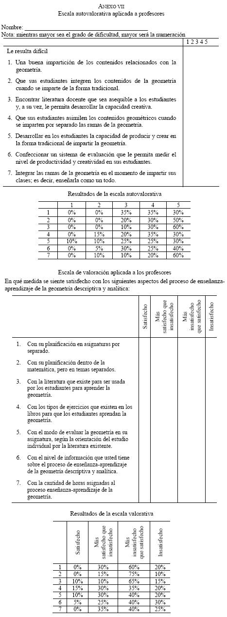 Al establecer un mismo lenguaje geométrico entre las matemáticas y la disciplina de Comunicación se le ha facilitado el trabajo a ésta, ya que las matemáticas ofrecen la herramienta teórica necesaria y la disciplina de Comunicación reafirma lo dado por la matemática y extiende su estudio a otros aspectos de la geometría propios de la arquitectura. Los resultados tocantes a una mejor calidad en la docencia y una retención escolar se deben a la incidencia de tal aporte en el proceso de enseñanzaaprendizaje de la geometría para arquitectos. Los Anexos I, II, V, VI, y VII muestran encuestas aplicadas a profesores y estudiantes donde aparecen comparaciones sobre el por ciento de promoción y otros instrumentos que comprueban nuestro planteamiento.