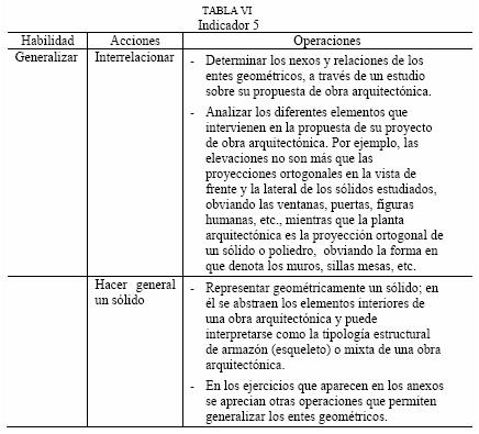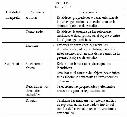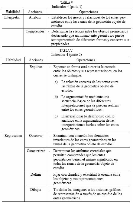 Indicador 4. Interpretación y representación de los entes geométricos de forma integrada: Permite que los alumnos lleguen a la esencia entre los objetos y sus representaciones geométricas, siguiendo las explicaciones del maestro en los dos elementos esenciales: acciones y operaciones, como se muestra en la tabla V.