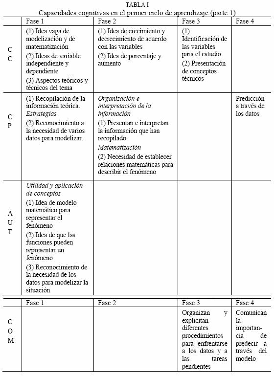 b) Análisis crítico de la información. Este es un aspecto esencial en la modelización, pues el aprendizaje a través de la modelización desarrolla un análisis crítico de ella (Alsina, 1998, Aravena, 2001). El grupo clasificó y seleccionó la información disponible, así como efectuó la búsqueda de datos, selección, análisis y relación entre las variables que les condujo a la formulación del modelo matemático. Con ello, el grupo pudo resolver el problema desde la base del conocimiento disponible, lo cual coincide con investigaciones que refieren que la modelización provoca una aproximación investigativa de la problemática estudiada (Alsina, 1998).