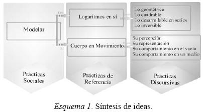 Consideramos así que estas prácticas se entremezclan y distancian en el derrotero de los logaritmos, pues una, en búsqueda de artefactos para facilitar la multiplicación y por tanto apoyar al desarrollo de la astronomía o la economía, encausa la discusión hacia la relación entre dos progresiones una geométrica y la otra aritmética, que nos lleva a multiplicar sumando. En tanto que la otra, dirige los esfuerzos hacia modelar fenómenos de la naturaleza tales como la caída de cuerpos, cuadrar curvas u otras cuestiones dentro de las matemáticas pero bajo la misma relación, la covariación de las progresiones mencionadas.