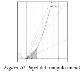Por otro lado, un argumento que es interesante discutir con los alumnos es el que surgió en este reporte, al explorar el efecto que hace manipular el triángulo inicial de construcción. Nadia, lo realiza en la primera actividad, arrastrando el triángulo de inicio para trazar funciones cuadráticas y determina que el efecto es "trasladar la curva a través del eje x". Sin embargo, en su exploración se observa que sólo mueve el triángulo (como se evidencia en la Figura 18) anclando los puntos origen de las semirrectas que se deben trazar en el eje y por tanto no traslada la construcción.