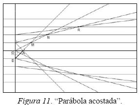 Valdez (2003), por ejemplo, para acercar a los estudiantes a la función cuadrática, propone una actividad en dos etapas. La primera donde el papel del alumno es observar el trazo de una parábola que se genera con el movimiento de un punto por la directriz y vinculado con otro (el foco) mediante una circunferencia; y la segunda, donde se le propone construir la parábola, es decir, reconstruir lo que ha observado mediante cierta guía. Propone entonces que "el alumno visualice la propiedad que define a una parábola [...] para que la transición a la parte algebraica le sea más fácil". Considerando además que "el alumno, auxiliado de sus instrumentos computacionales, construya una versión del conocimiento". Intenta recuperar aquí, la esencia de una cónica donde la distancia entre puntofoco y puntodirectriz se mantiene constante utilizando "traza" y "animación" como herramientas.