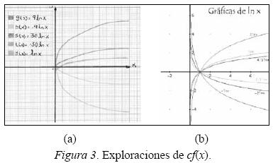 Por otro lado, se les solicita que exploren la multiplicación de una función por una constante, es decir y = cf(x), y entreguen un informe explicando sus hallazgos. En las conclusiones parciales, que leemos en sus reportes, algunos estudiantes mencionan "incrementardecrementar"; otros "estirar o escoger" pero otros sólo perciben el efecto de reflejar sobre el eje x diciendo que "siguen un comportamiento positivo o negativo". En el caso de la función logaritmo, reconocen que utilizar una constante positiva mayor que 1 eleva la curva, en tanto que al ser negativo, la invierte. Sin embargo, al reproducir las gráficas en el papel milimetrado, centran su construcción alrededor del origen, y no del punto (1, 0) (Ver Figura 3a), explicando sus conclusiones diciendo: al multiplicar nuestro lnx por 9, nos muestra como incremento 9 unidades en la gráfica, la cual extiende hacia la derecha de manera positiva, sobre el eje y; como en el caso anterior multiplicamos, ahora nuestro lnx con 9 encontramos una gráfica que tiene un decremento de 9 unidades, extendiéndose sobre el cuarto cuadrante.