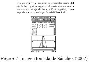 Por su parte, Sánchez (2007) considera que: uno podría fácilmente concluir que, el uso de software en un escenario de instrucción a distancia, influye de manera positiva en el desempeño de las personas involucradas en la resolución de actividades matemáticas, sin embargo, como se puede apreciar en la figura, la influencia que ejercen estas herramientas en las técnicas de resolución, pueden traer como consecuencia concepciones erróneas acerca del objeto matemático analizado. En esta situación, a pesar de que se utiliza la técnica del análisis de casos particulares, el profesor obtiene una conclusión equivocada sobre el efecto que produce el parámetro sobre la gráfica de la función cuadrática (ver Figura 4).