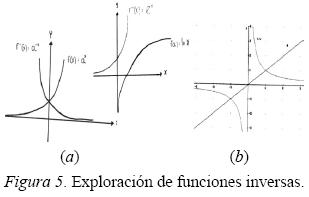 En general, los textos de Cálculo discuten la función inversa desde la simetría geométrica de las funciones respecto a la recta y = x, siendo extendida en la mayoría de los alumnos a otros tipos de simetrías (ver Figura 5a). Ejemplo de ello es el rescate de uno de los argumentos más utilizados escolarmente en un reporte de tres estudiantes, de segundo semestre de Ingeniería Industrial, donde la función exponencial y la función logaritmo aparecen como inversas desde una gráfica simétrica, en tanto que en la segunda exponencial elegida asocian otra exponencial como su inversa (ax