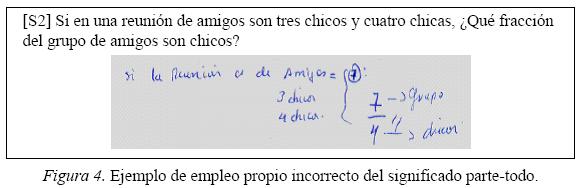 Si se parte del supuesto que se ha superado todo tipo de interferencia, la manifestación de la comprensión de la fracción aún exige que su empleo en su significado propio, sea correcto en cada situación dada. El número de respuestas correspondiente a la categoría de empleo propio correcto refleja que esta faceta de comprensión se ha presentado de forma desigual en las distintas situaciones propuestas en la prueba (véase tabla II). Actuaciones como la recogida en la figura 4 ilustran el caso del estudiante que, aun haciendo uso del significado de fracción correspondiente a la tarea, expresa limitaciones de comprensión relativas a la propia naturaleza del significado. En este ejemplo, el empleo propio del significado partetodo viene acompañado de una confusión acerca del papel que desempeñan y la posición que ocupan la parte y el todo en la representación numérica de la fracción. Se trata en definitiva, del tercer aspecto diferente, exteriorizado en la comprensión de los significados de la fracción.