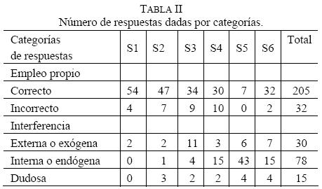 El fenómeno de interferencia se observó e interpretó, a partir de las respuestas escritas que presentaron los participantes en cada tarea. Las respuestas fueron clasificadas como sigue: