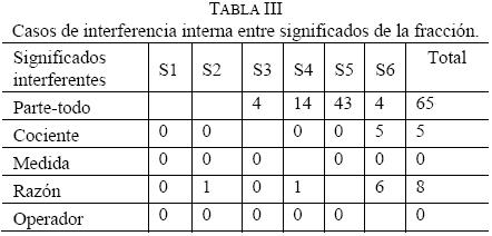 El modelo establece el vínculo 'situaciónfracción', que garantiza la superación del fenómeno de interferencia externa. La condición siguiente para la comprensión, establece el empleo de aquel significado de la fracción que le es propio a cada situación. El estudio empírico exhibe que esta condición no siempre se cumple y surge entre los participantes el fenómeno de interferencia interna. Los resultados presentados en la tabla II muestran la presencia de este fenómeno en el desempeño de los estudiantes, en 78 respuestas. Con el fin de ahondar en este tipo de respuestas, en la tabla III se describen con más detalle los diferentes casos de interferencia entre significados de la fracción, junto con las frecuencias absolutas registradas en la prueba. Se identificaron ocho casos diferentes de interferencia interna, producidos entre los significados: