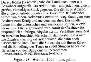 Contra isso, eu não achei nenhuma tradução alemã de Heródoto onde fosse utilizada a palavra "Geometrie". Ou se fala de "Landvermessung" então, agrimensura ou mesmo de Kunst der Landvermessung. Esta maneira fica marcadamente em contraste com a tradição da história da matemática em que se refere a Heródoto para deduzir que a geometria teórica grega tem origens no Egito. Como a agrimensura foi praticada no Egito já no tempo de Heródoto e desde épocas muito remotas, o sentido dessa relação certamente não recai sobre o nascimento da agrimensura, mas sobre o fato de que a partir dela se desenvolveu uma forma superior a saber, a geometria que constituiu já na época de Heródoto um conceito firme e, além disso, que os gregos tinham recebido tanto a geometria como a astronomia por outras culturas.