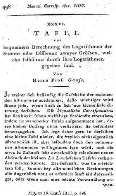"Quanto mais amplamente se estendem os negócios dos astrônomos calcu to mais importante tornase para eles cada facilidade que em si poderia parecer assim pequena . [...] a pequena tábua é todavia não verdadeiramente astronômica, porém há de ser particularmente bemvinda ao astrônomo calculador [...]. O negócio, que a tábua deve facilitar, encontrase a cada momento nos cálculos astronômicos; sem a tábua é preciso procurar três vezes os logaritmos ou após uma transformação fácil, em todo caso, duas vezes; mas aqui as operações reduzemse a uma só". (Gauß 1828, 253)