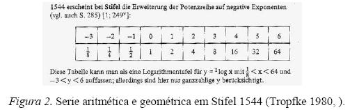 Como introdução, vou dar algumas explicações históricas sobre o conceito. A idéia principal subjacente aos logaritmos consiste em relacionar uma serie geométrica com uma serie aritmética: tal idéia encontrase, bastante clara, pela primeira vez na obra Aritmetica Integra do alemão Michael Stifel, em 1544 e que se pode interpretar hoje como exprimindo um logaritmo particular.