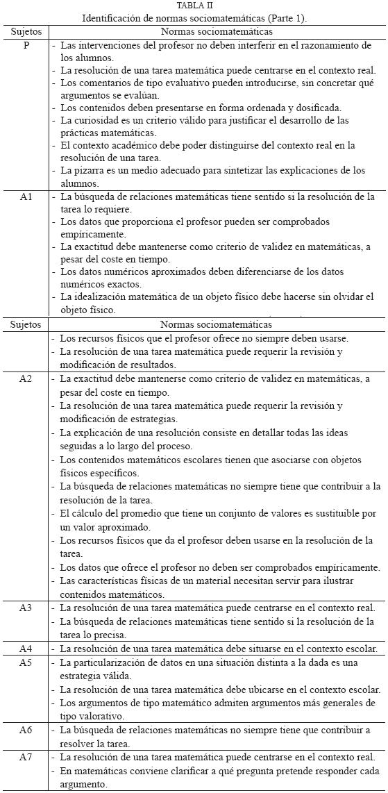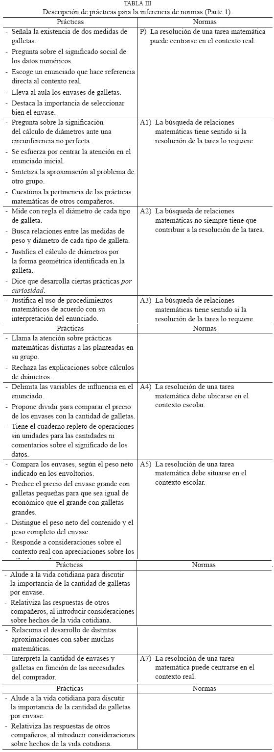 Respecto a la enunciación de las normas, partimos de la forma en que se mencionan las prácticas matemáticas y destacamos la función reguladora de algunos contenidos mediante los cuales se expresan dichas prácticas. Por ejemplo, una de las prácticas de A7 es: Alude a la vida cotidiana para discutir la importancia de la cantidad de galletas por envase. Esta práctica, junto con otras, hace razonable inferir la siguiente norma: La resolución de una tarea matemática puede centrarse en el contexto real.