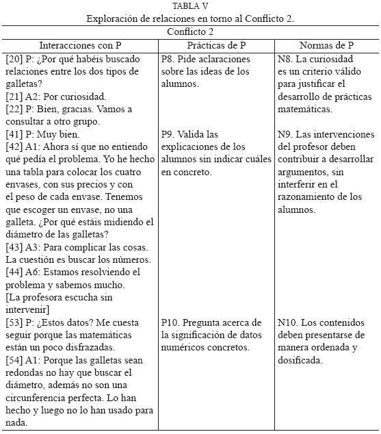 La tabla V refiere que la aparición del Conflicto 2 también tiene que ver con las intervenciones de la profesora durante la resolución de la tarea. La situación didáctica generada al responsabilizar a los alumnos de que otorguen sentido al discurso matemático de sus compañeros hace que surjan dudas acerca de qué prácticas son adecuadas. La profesora pregunta sobre el modo en que se exploran las prácticas, sin señalar que algunas no son útiles en la resolución de la tarea.