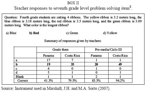 Box II presents an example item from the middle school level together with teacher responses by category. The idea is once again to expand the description of teacher knowledge using a reallife example. The question is not very difficult, although it tests a higher order skill than the geometry item in box I (ordering decimals). The premedia (Panama) and Ciclo III (Costa Rica) teachers perform well, especially the Costa Ricans. The large gap in knowledge levels is most evident in third grade, where the Costa Rican third grade teachers score almost as high as the Panama middle school teachers. And the Panama third grade teachers demonstrate a serious lack of knowledge about this particular content area.