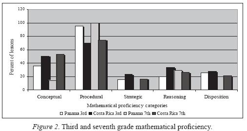 Larger differences between countries are observed for seventh grade lessons (figure 2). It bears restating that these differences are based on fairly small samples of classrooms (7 for Panama and 19 for Costa Rica). All lessons in Panama were about computing or following a procedure with a few making linkages to the underlying concept. In Costa Rica a higher percentage of lessons attempted to relate the procedure with the concept (or concepts). Again, not all teachers were effective at it. In Panama, none of the lessons made linkages of the mathematics to problem solving and in Costa Rica very few did soabout the same percentage as third grade. The logical thinking and reasoning were also low in both countries. A better level of productive disposition was observed in Costa Rica lessons; however it is still low in absolute terms. Overall, the mathematics instruction in Costa Rica for seventh grade "looked" closer to the mathematical instruction in third grade. More pronounced differences between grades were observed in Panama.