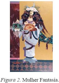 Tomemos, por exemplo, a obra de Rodrigo de Haro2, Mulher Fantasia3 (ver figura 2). Nela podemos observar o traçado da perspectiva, não mais como nas obras renascentistas, onde a imagem criada seguia as regras da técnica de projeção central, com apenas um único ponto de fuga, mas a inserção de muitos pontos de fuga.