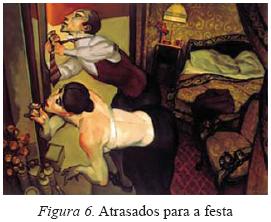 A título de exemplo tomemos a obra Atrasados para a festa4 (ver figura 6) do artista catarinense Juarez Machado5. Como o título menciona, o autor buscou representar um casal que se prepara para uma festa, cuja riqueza de detalhes nos móveis, cortina e papel de parede nos remetem a ideia de que os dois possam estar em um quarto de hotel e pertencem a uma classe social de nível alto. Observando um pouco mais a vestimenta do casal e o tom intenso da maquiagem da mulher, podemos supor que a festa sobre a qual o autor se refere trata de um baile de gala.