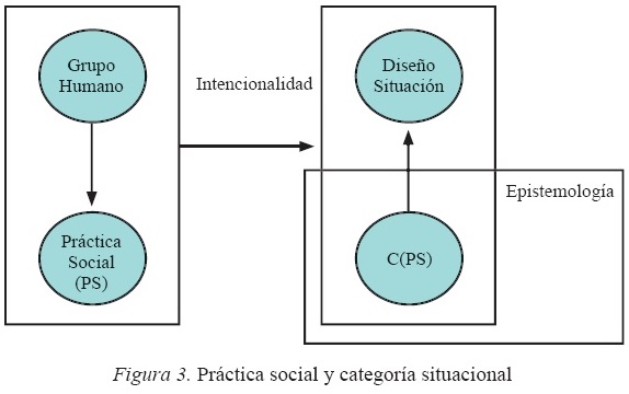 Con el propósito de generar una matemática funcional y trabajar con epistemologías de prácticas se debe identificar al grupo humano y cómo ellos se organizan para poder observar cuál es la práctica que emerge. Una vez identificada esa práctica social y el querer insertar dicha práctica y desarrollarla con intencionalidad en el sistema didáctico, debe ser reinterpretada; es por eso que se forma una categoría de la práctica social (C(PS)), ausente en el currículo, donde en una situación específica, dicha práctica pasa a ser el argumento que sostiene la situación (figura 3).