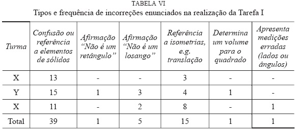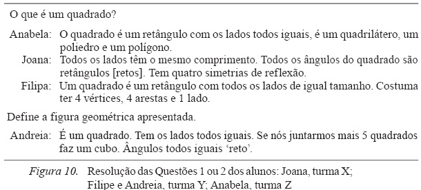 No que diz respeito à definição de quadrado apresentada pelos participantes, podemos concluir que mais de metade dos alunos (54%) na resposta às questões 1 e 2 da tarefa II, não menciona qualquer referência à congruência de lados ou de ângulos, sendo a congruência de ângulos a unidade de registo menos citada. Contudo, o número de alunos que, elenca um conjunto de propriedades dispersas (não relacionadas com a congruência) nem sempre necessárias ou suficientes, para definir quadrado é muito elevado. Em particular, o número de alunos (12 num universo de 26, na análise realizada na turma Z) que faz referências ou associa propriedades do quadrado como sendo propriedades do cubo ou de outros sólidos geométricos, é significativo.