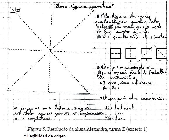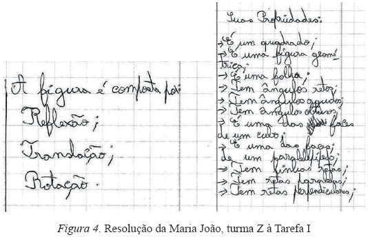 A unidade de registo mais mencionada, por 19 alunos, foi a 11 "É um quadrado", sendo que, quase todos estes alunos escreveram esta referência no início da resolução da tarefa (Figura 4), deduzindo este facto por visualização enão pela análise das propriedades da figura. É interessante notar que, mais demetade dos alunos (16), relacionaram esta tarefa como tópico "Reflexão, rotação e translação" (Ponte et al., 2007), uns fazendo a referência a estas transformações geométricas e outros realizando dobragens ou reproduções do quadrado (Figura 5).