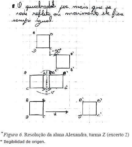 Pela análise da Tabela VI, podemos concluir que existem muitas referências a elementos de sólidos geométricos, concretamente do cubo, para a caraterização das propriedades do quadrado, como por exemplo, "arestas" ou "faces" (Figuras 4, 7 e 8). Também alguns alunos fazem referência a isometrias, nomeadamente, à translação, o que pode ser explicado tendo em atenção que esta tarefa, como já referido anteriormente, foi aplicada no início da lecionação do tópico "Reflexão, rotação e translação" (Figuras 4 e 6).