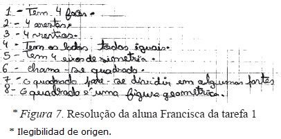 Salienta-se ainda a existência de 12 alunos que ao enunciar as propriedades da figura geométrica em questão, a comparam com o cubo ou indicam que a esta é uma face do cubo ou referem ainda como propriedades da figura a existência de "4 arestas" ou "1 face" (Figura 7). Este facto poderá estar relacionado com um dos objetivos específicos enunciado no Programa de Matemática, em que no 1.º ciclo os alunos identificam e representam polígonos através dos sólidos geométricos (Ponte et al., 2007, p.22).