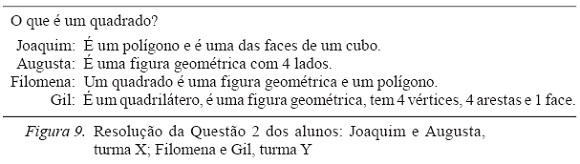 Em ambas as questões, mais de metade dos alunos, não considera necessária a referência à congruência para a definição de quadrado, mencionando nas suas respostas outras propriedades comuns a outros polígonos ou referindo caraterísticas de sólidos geométricos (Figura 9).