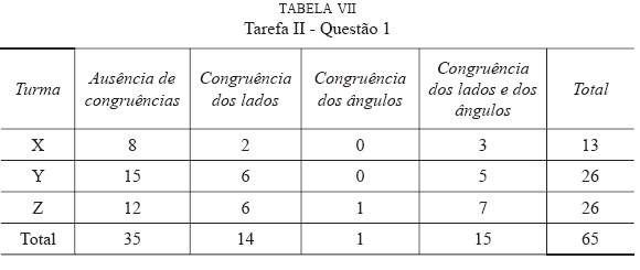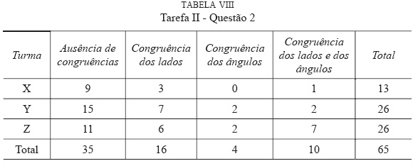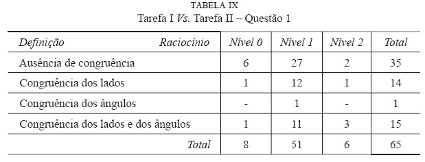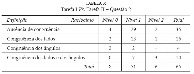 Na procura de uma possível relação entre o nível de raciocínio geométrico apresentado pelos alunos e a sua capacidade de definir quadrado, foram tomadas duas opções: a primeira, consistiu em considerar para análise apenas os alunos das três turmas que realizaram as tarefas I e II (questão 1 e 2), ou seja, 65 alunos; a segunda, baseou-se no cruzamento dos dados obtidos na análise da tarefa I (nas categorias Nível 0, Nível 1 e Nível 2) e dos dados recolhidos na análise da tarefa II (nas categorias Ausência de congruência, Congruência dos lados, Congruência dos ângulos, Congruência dos lados e dos ângulos), nesta segunda opção, a comparação foi levada a cabo para ambas as questões, como se pode constatar nas tabelas IX e X.