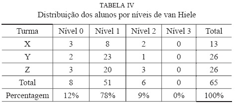 Após efetuada a codificação das unidades de registos nas transcrições das respostas à Tarefa I dos 65 alunos que realizaram todas as tarefas propostas, no universo dos 73 alunos, cada um deles foi colocado num dos níveis de van Hiele, de acordo com a predominância do algarismo das dezenas nos códigos estabelecidos para as unidades de registo. Esses dados sumarizam-se na seguinte tabela: