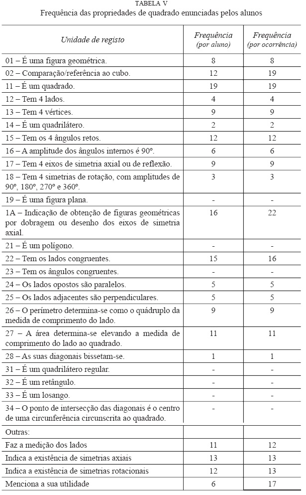Esta primeira análise permitiu colocar cada um dos alunos num dos níveis de van Hiele. Observando a tabela IV, constatamos que a distribuição dos alunos pelos quatro níveis é idêntica nas três turmas, pelo que se optou por analisar mais pormenorizadamente apenas uma das turmas: a turma Z. Para levar a cabo esta segunda análise, recorreu-se ao programa de análise qualitativa NVivo8, estudando novamente as resoluções dos alunos relativamente à Tarefa I, calculando agora a frequência de cada uma das unidades de registo, resultados sintetizados na tabela V: