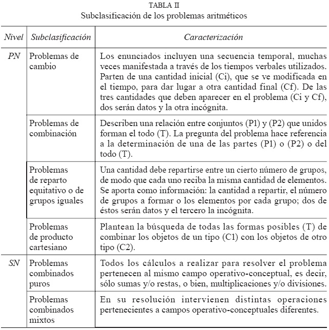 Los instrumentos elaborados para la recolección de datos estaban compuestos de problemas aritméticos. Para la selección de estos últimos se consideró la caracterización, por un lado, de los problemas PN o SN y, por el otro, la sub-clasificación de los niveles anteriores (ver Tabla II) que realiza Echenique (2006).