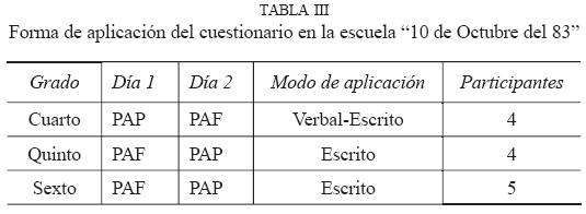 La aplicación de los cuestionarios en las dos escuelas (Tablas III y IV) se hizo en dos días hábiles, de la siguiente forma:
