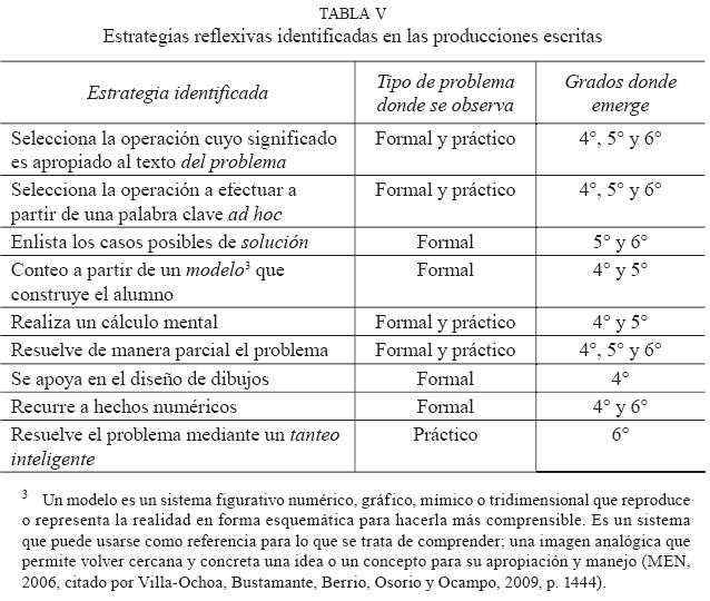 En los demás grados, las respuestas son similares y las estrategias empleadas se caracterizan sólo como reflexivas. En su mayoría, los problemas son resueltos correctamente, a excepción de uno donde se comete un error de cálculo.