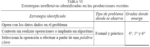 Las producciones escritas (cuestionarios) y orales (entrevistas) de los estudiantes permiten responder la pregunta: ¿cuáles son las estrategias que utilizan los niños Tee Savi (mixtecos) de primaria cuando resuelven problemas aritméticos formales y prácticos? Cuya primera respuesta es que estos alumnos, emplean tanto estrategias reflexivas como irreflexivas en las producciones escritas. En ese sentido, en los cuestionarios emergieron nueve estrategias caracterizadas como reflexivas y tres irreflexivas. Las reflexivas se presentan con mayor frecuenciaen los problemas aritméticos prácticos, mientras que las irreflexivas en los formales (Tabla VII). Por otra parte, en las producciones orales, se observó que en los problemas aritméticos prácticos verbales afloran sólo estrategias reflexivas, donde las comunes a los tres grados son: conteo a partir de un modelo construido y realiza un cálculo mental. Mientras que aquellas que son comunes en dos grados son: