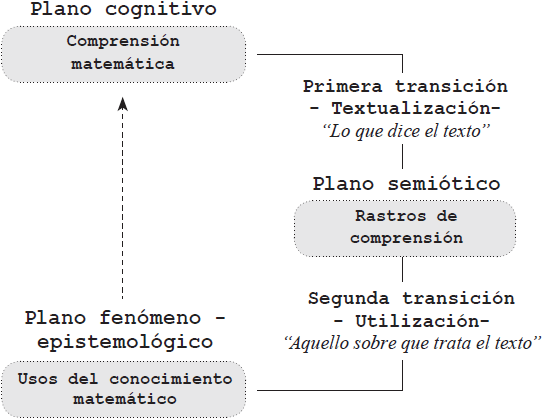 Aunque la comprensión y la interpretación se ejerzan sobre la mediación de un texto, rebasan el campo de lo meramente semiótico. La capacidad para utilizar el conocimiento matemático depende en buena medida de su comprensión, por lo que situamos la referencia de la comprensión del estudiante, no ya en el propio registro escrito, sino en el uso del conocimiento matemático que deja entrever. Por ello, encauzamos la búsqueda de la comprensión matemática en una dirección que parte de un texto, pero prosigue más allá de él hacia el empleo del conocimiento matemático (Figura 2).