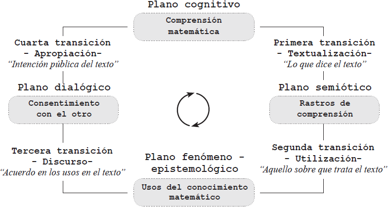 En definitiva, el consentimiento con el otro nos ofrece una vía para retornar a la comprensión matemática. Por medio del protagonismo final adquirido por el estudiante, garantizamos de nuevo el carácter cognitivo de su comprensión, desplazado provisionalmente al comienzo del círculo, y con la correspondiente apropiación completamos de un modo más inclusivo nuestra propuesta para interpretar la comprensión de la actividad matemática en el aula.