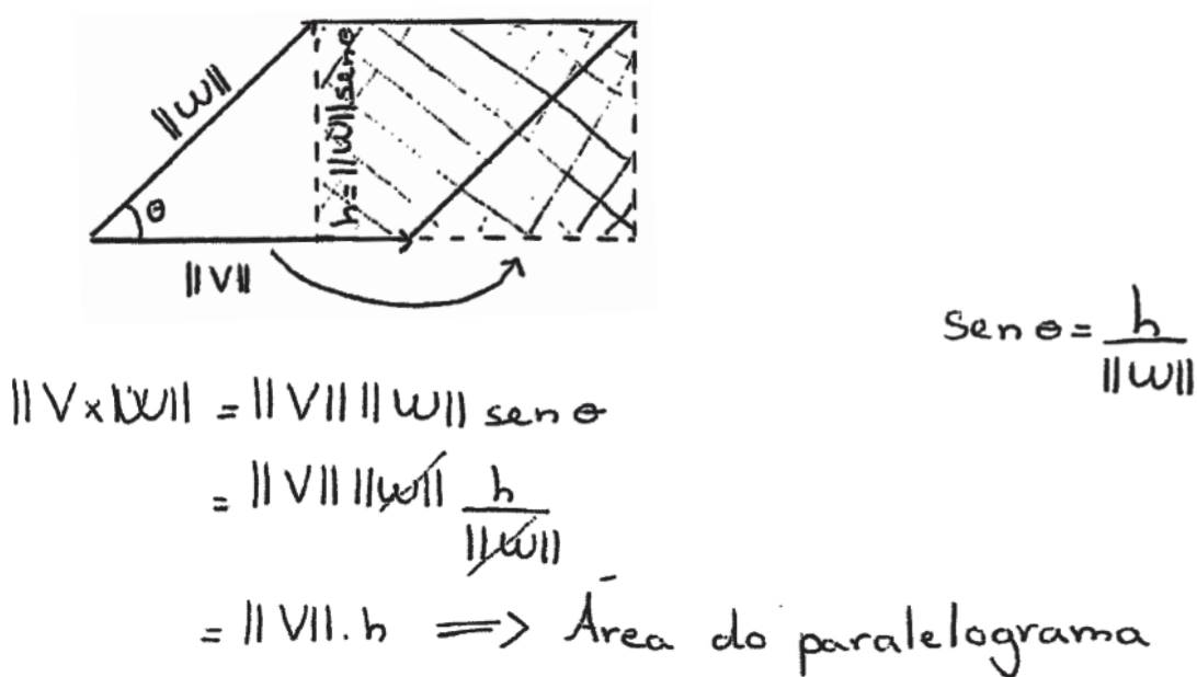 Após uma introdução em linguagem verbal, escreve a norma do produto vetorial dos referidos vetores em linguagem algébrica. Relaciona depois, numa conversão da linguagem visual para a linguagem algébrica, a altura do paralelogramo com a norma de um dos vetores e a amplitude do ângulo por estes formado. A Maria realça ainda o motivo, recorrendo essencialmente a linguagem verbal, para utilizar a razão trigonométrica seno.