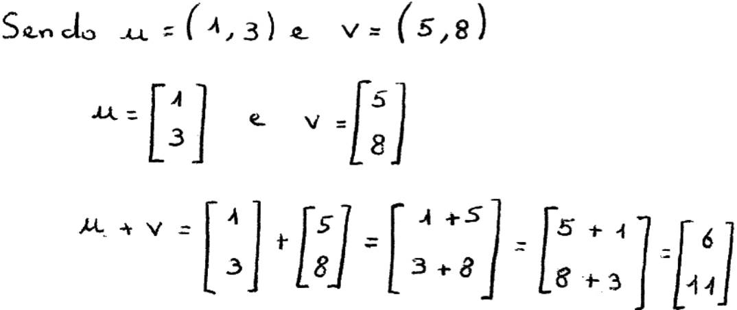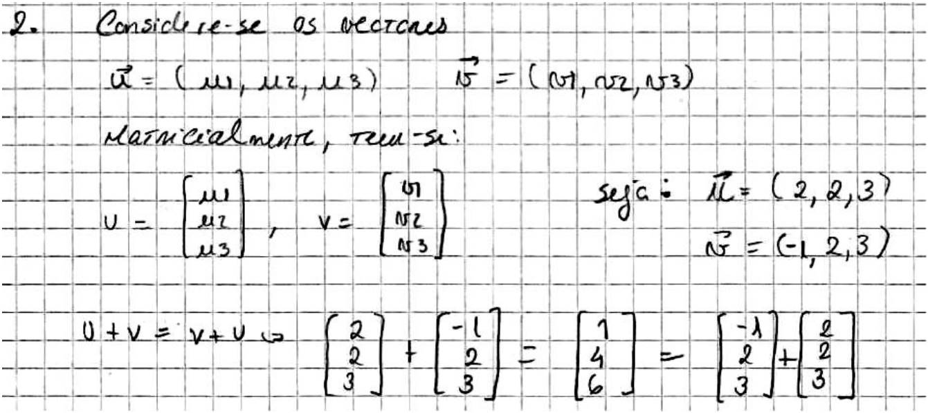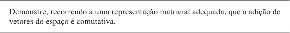 Na tarefa TCAV na Fig. 4, um trabalho de casa, pedia-se uma demonstração matricial da comutatividade da adição de vetores do espaço (pela terminologia das aulas, ℝ3). Uma resolução passa pela representação algébrica dos vetores com matrizes coluna, ou linha, e pela comutatividade da adição de matrizes demonstrada, no âmbito das propriedades da álgebra matricial, numa aula anterior. Alternativamente, pode-se invocar a comutatividade da adição de números reais nas entradas das matrizes soma resultantes.